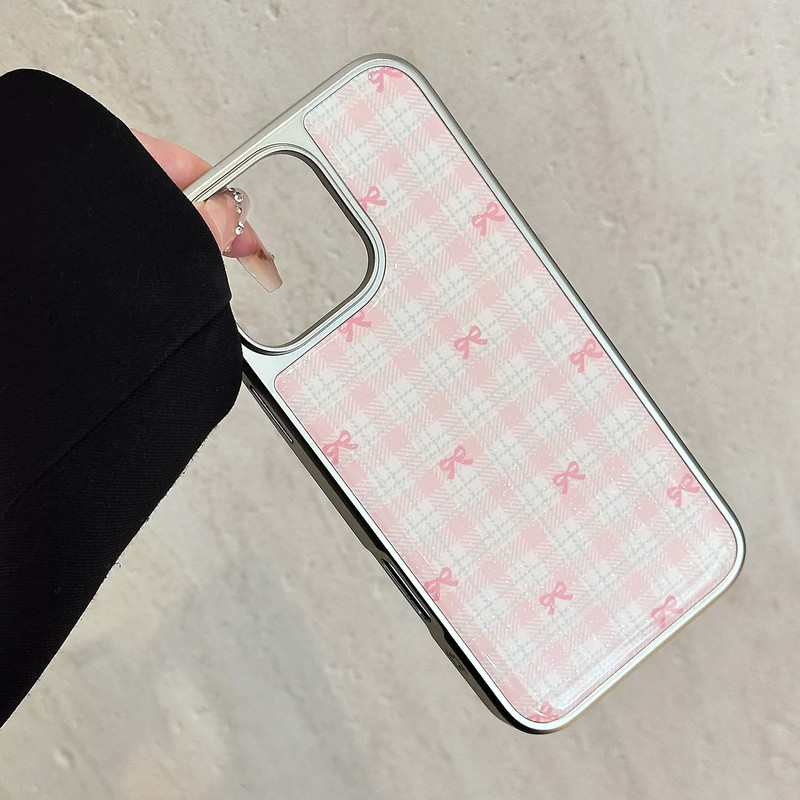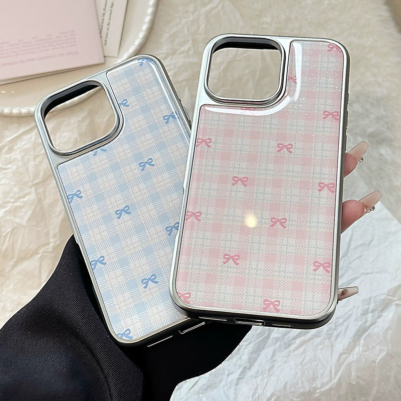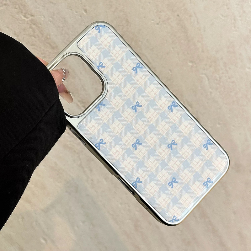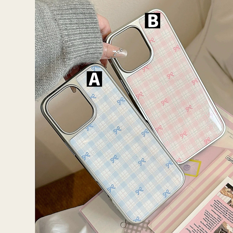 Blue pink ribbon check silver side iphoneケース