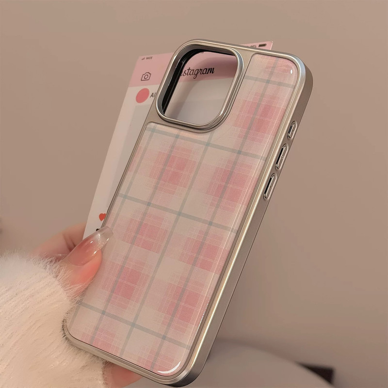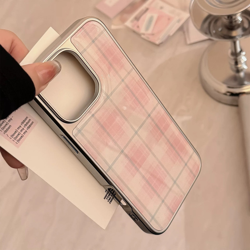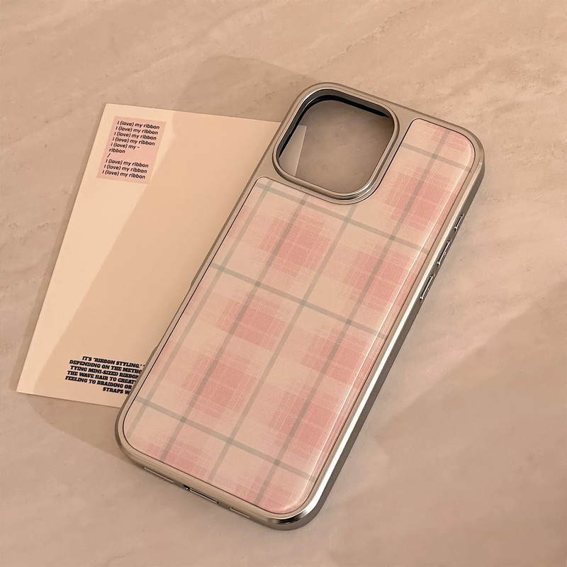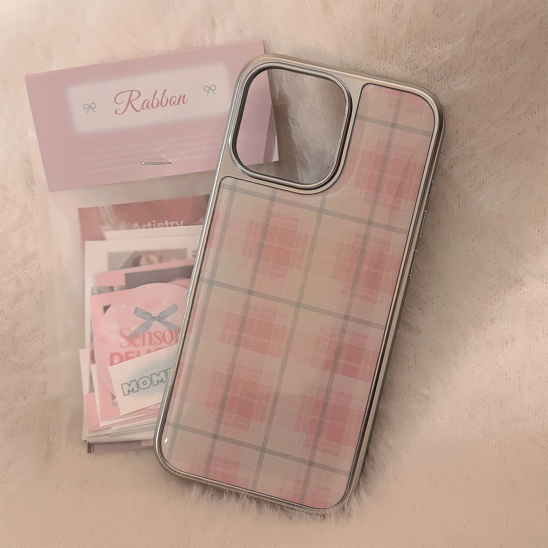 Pink white check silver side iphoneケース