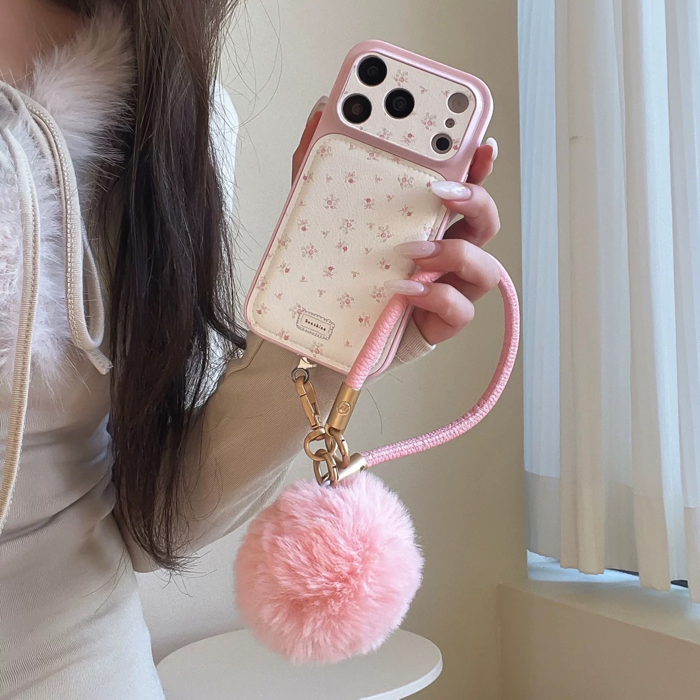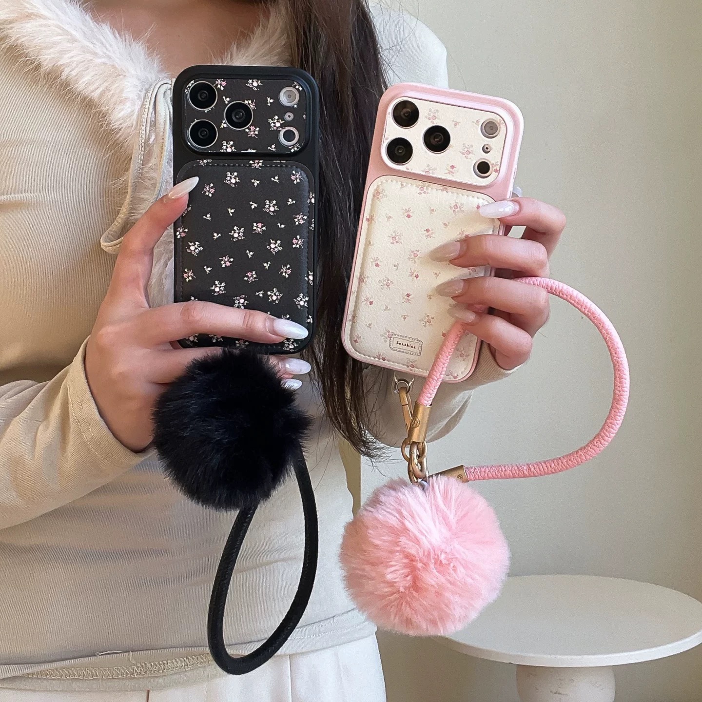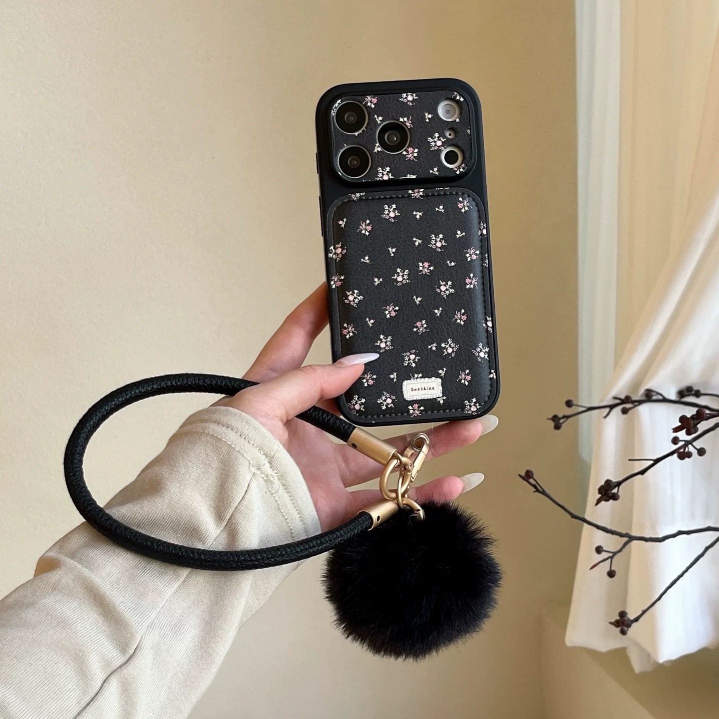 Black pink flower fur strap iphoneケース