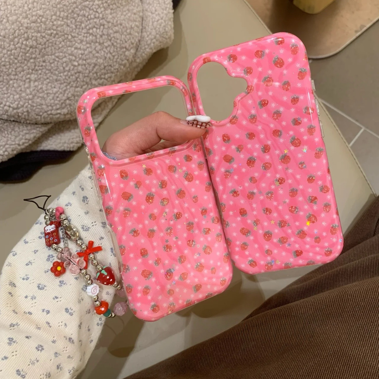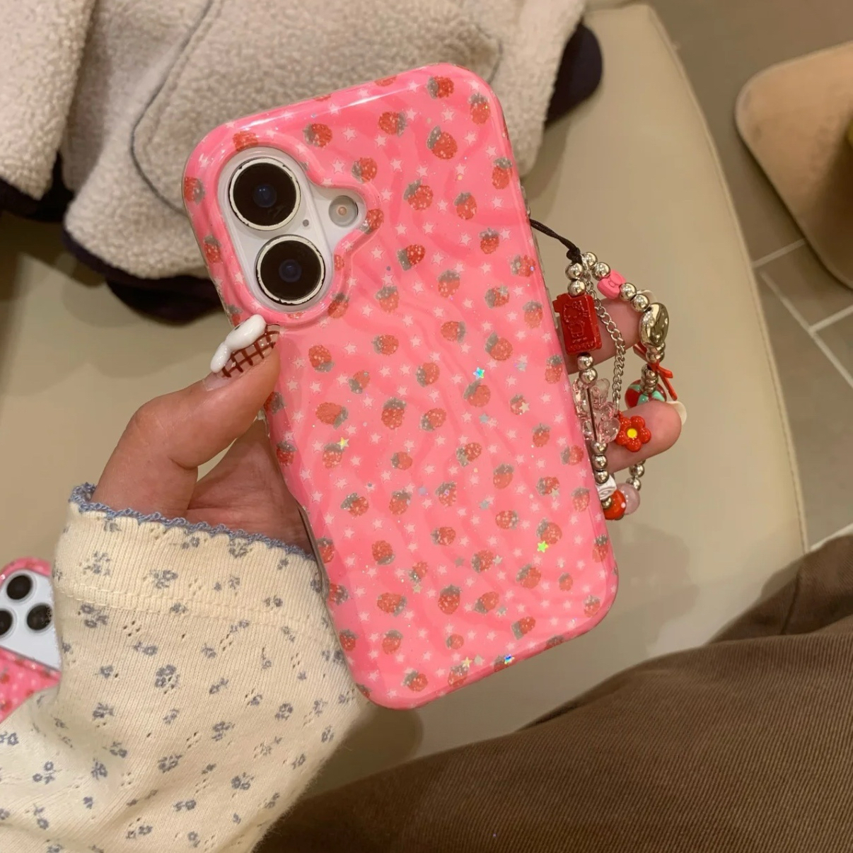 Pink starwberry pattern strap iphoneケース
