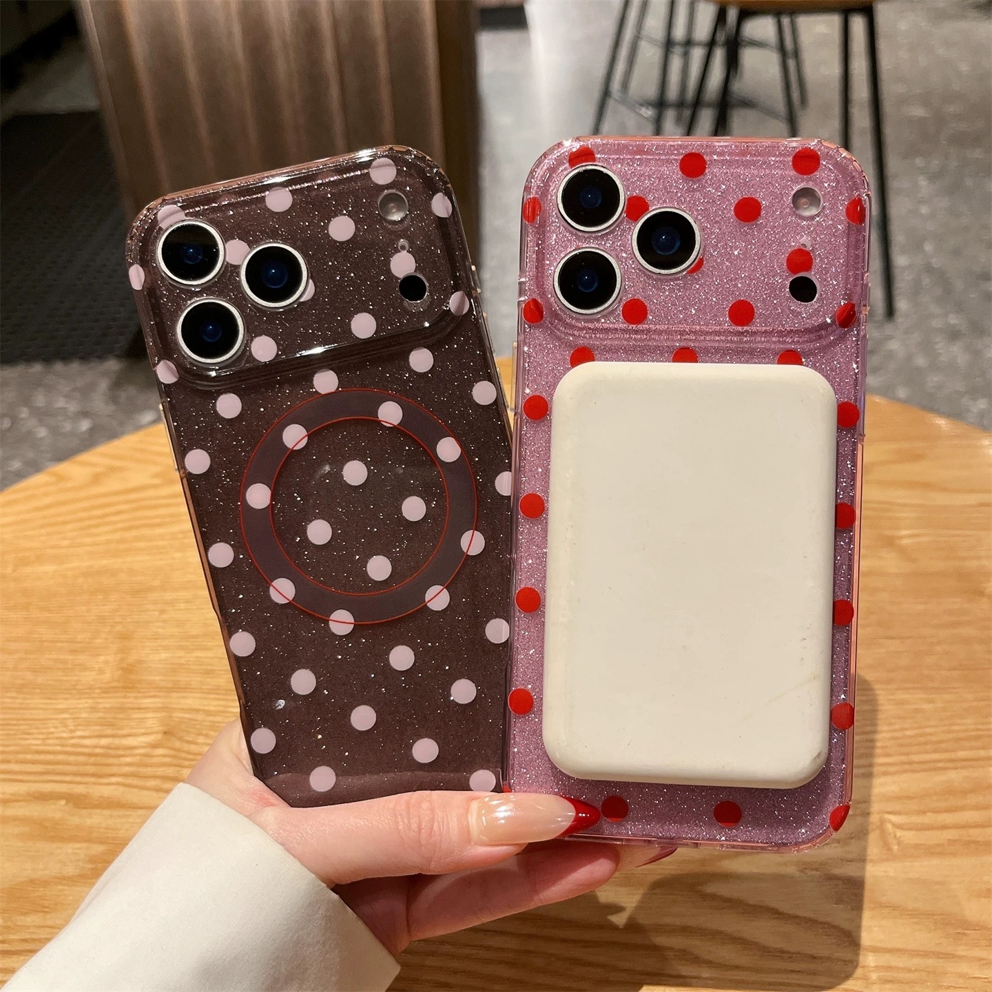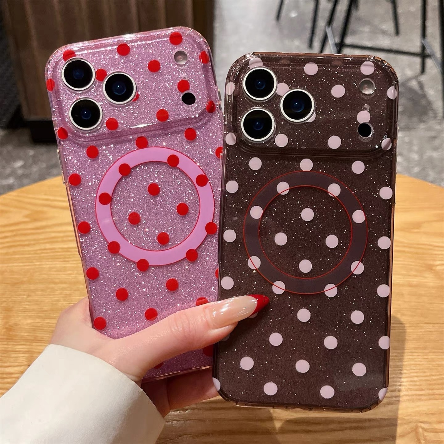 Pink brown dot glitter magsafe iphoneケース【Magsafe対応】