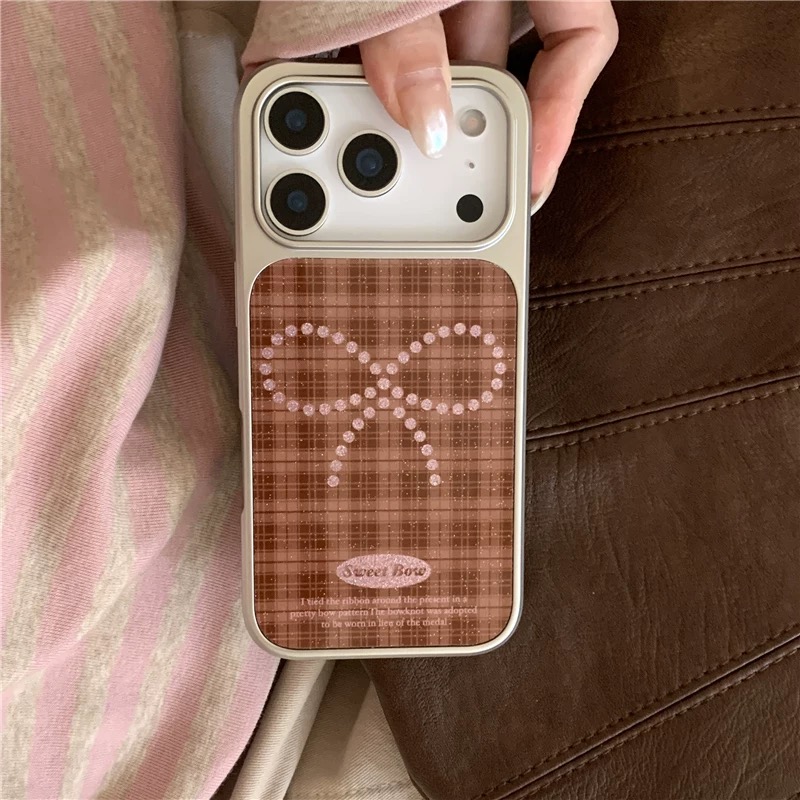 ピンクブラウンチェックリボンシルバーサイド iphoneケース